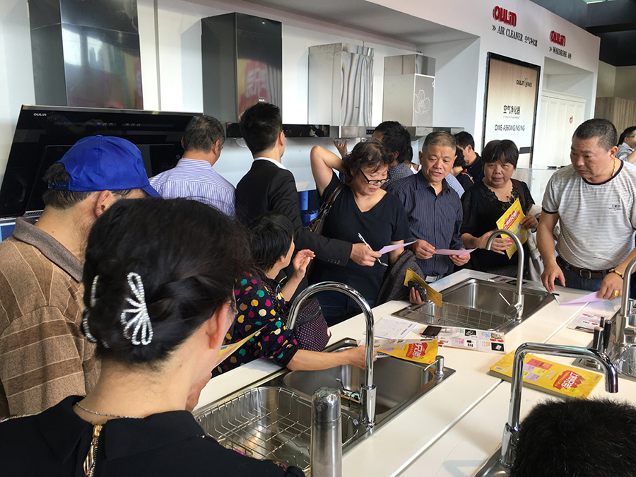 活動(dòng)還未開(kāi)始,OULIN歐琳的展賣廳中便已擠滿了慕名而來(lái)的顧客,工作人員耐心地解答著顧客的詢問(wèn),并專業(yè)地為顧客指導(dǎo)裝修廚房、選購(gòu)廚房產(chǎn)品的注意點(diǎn)。