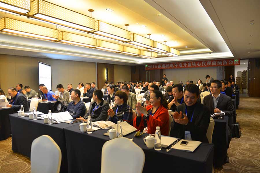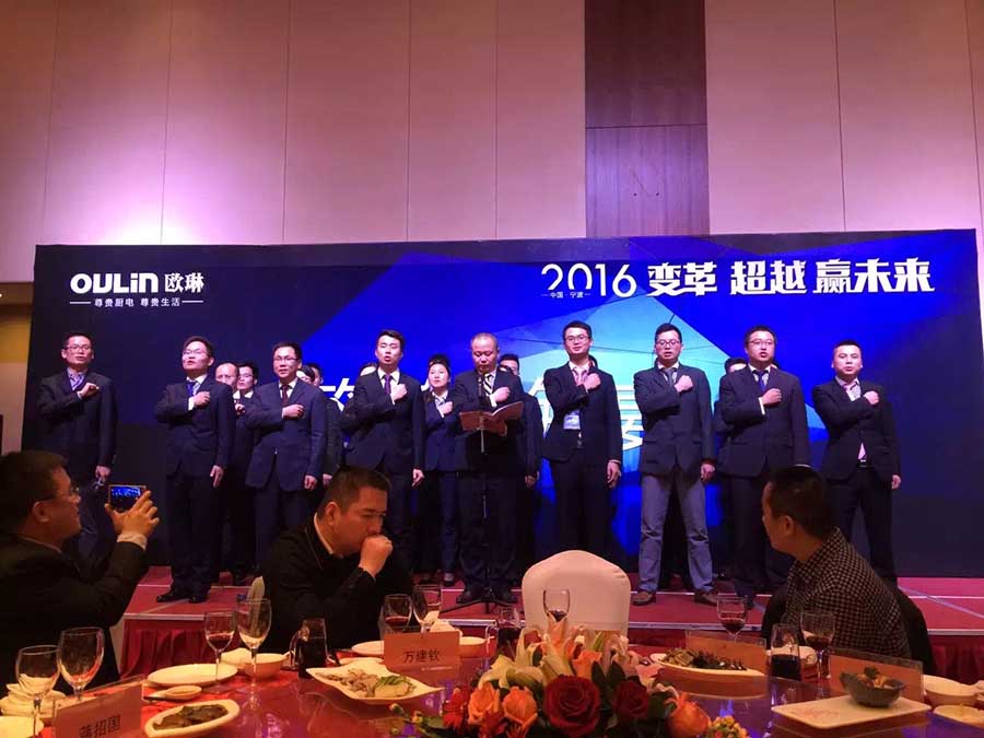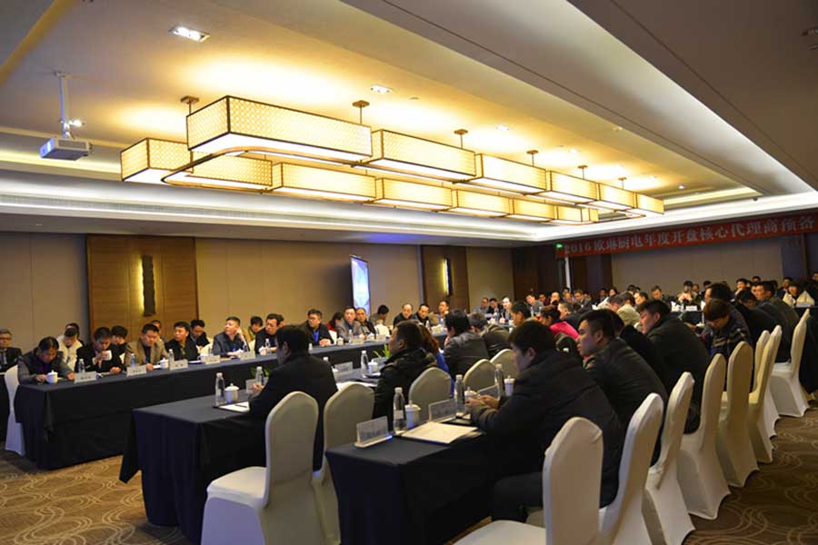 在2015年倒計時23天的時候, OULIN歐琳廚電公司2015年度核心經銷商大會,在寧波東錢湖恒元酒店隆重召開,OULIN歐琳集團總裁徐劍光、副總裁謝忠定、集團市場總監李柏強、廚電事業部總經理陳四海及全國100余位新老經銷商朋友悉數到會。會議以“變革 超越 贏未來”為主題,分析在廚電大市場環境與趨勢,謀定2016年OULIN歐琳廚電的發展方向與策略。