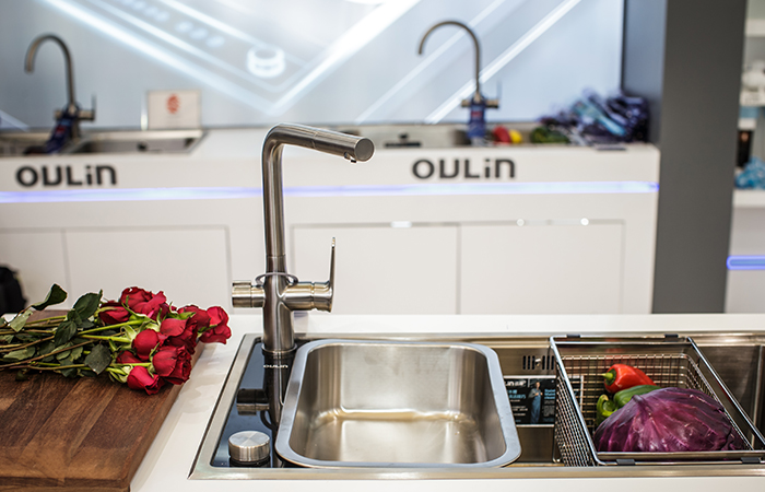 隨著新常態下家庭生活需求的不斷膨脹,健康、環保等成為了不容忽視的關鍵詞。水槽作為歐琳最有代表性的產品,除了一貫保證的設計感和品質之外,歐琳更是通過大量的研發科技投入,推出健康智能水槽系列產品,其中“凈水水槽”便是最具代表性的一款跨界整合精品,一經推出便引發行業內廣泛討論,此次不負眾望亮相展會,更多參展者得以一睹真容。這款將水槽與凈水科學整合的新型廚房神器,規避了凈水產品占用空間、臺下操作的不便,并實現臺上觸屏控制、濾芯更換提醒、一個龍頭四種出水等人性化功能。